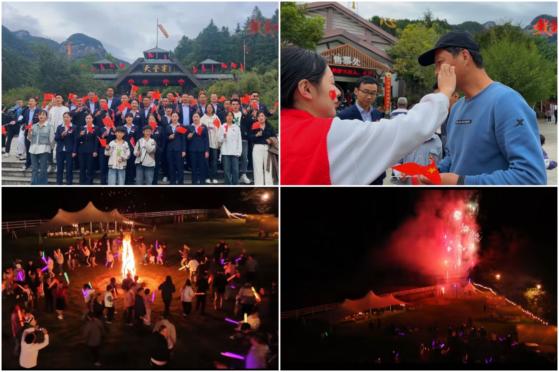 秋风秋景秋醉人,欢歌笑语绘华章。国庆期间,天堂寨景区张灯结彩,五星红旗迎风招展,一派喜庆祥和的景象。景区工作人员统一着装,面带微笑,免费为游客发放小国旗、脸贴、镂空打卡牌、金秋书签等小礼品,让游客充分感受到了景区的热情和节日的气氛。10月1日至4日,景区在游客中心举办“国庆天天乐”活动,“同唱国歌为祖国献礼”“烟火璀璨、庆祝华诞”“星空露营、品味吊锅”“我把秋天带回家”等多个节庆活动热闹纷呈,为新中国成立75周年献礼。